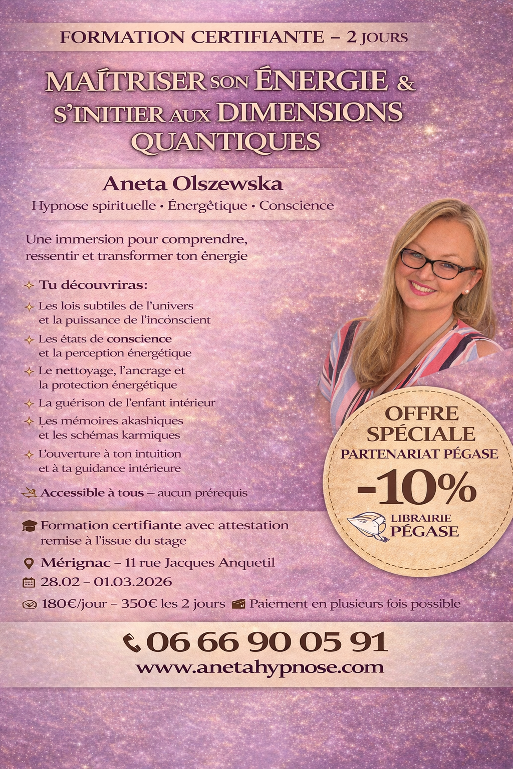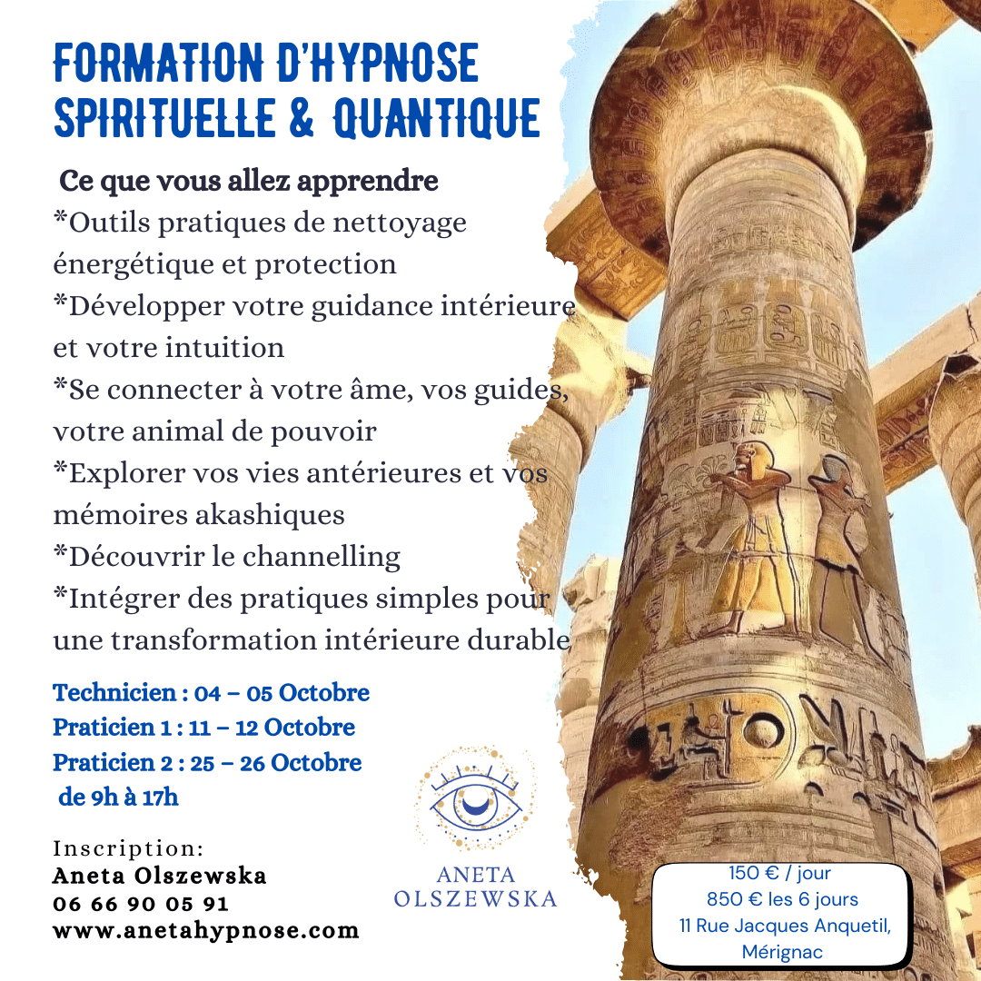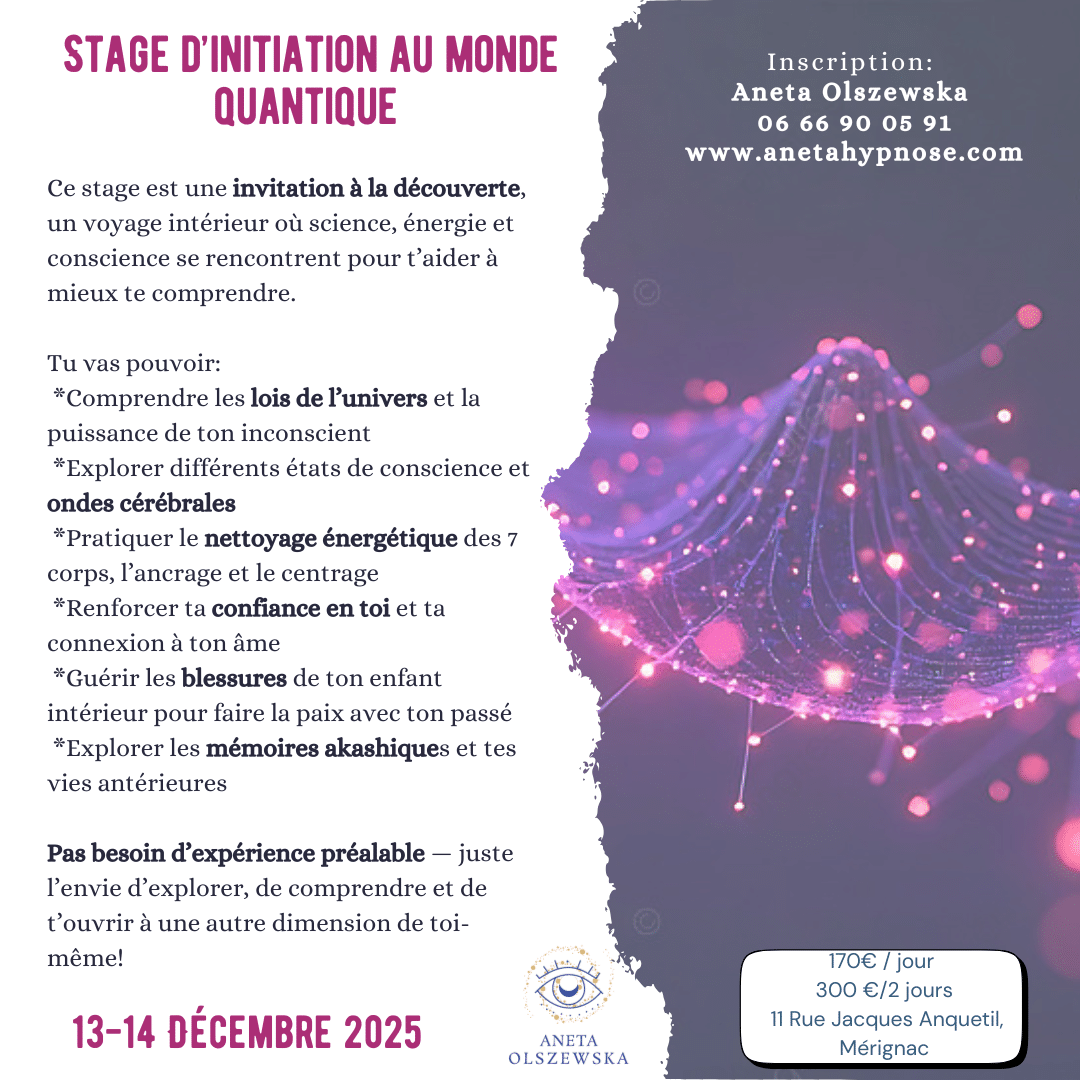 Cette formation, c’est une immersion pour : Comprendre les lois subtiles de l’univers, Ressentir ton énergie et affiner ta conscience, Nettoyer, ancrer et te protéger énergétiquement, Libérer l’enfant intérieur, Explorer les mémoires akashiques et les schémas karmiques, Ouvrir ton intuition et ta guidance intérieure